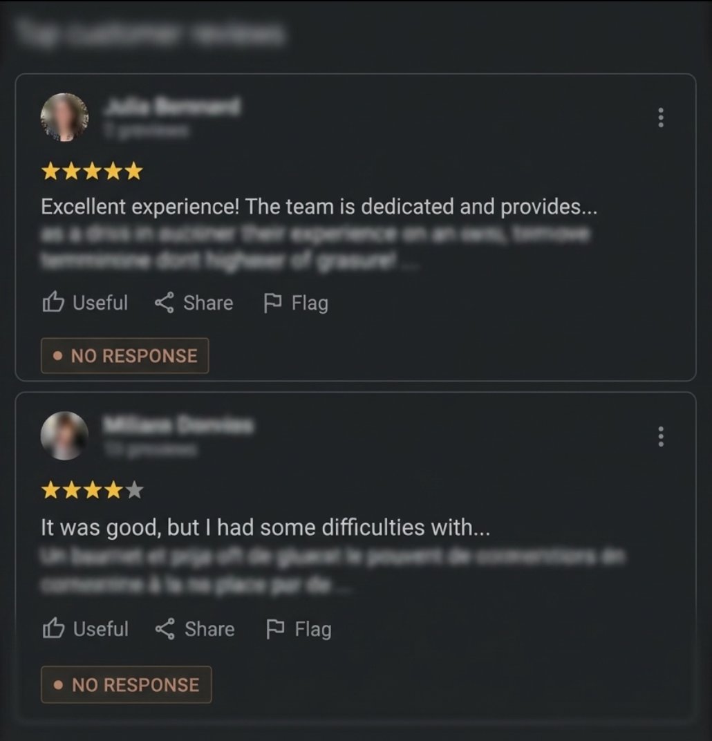Chaque avis reçoit une réponse professionnelle en français ET en anglais, dans les 48 heures.Every review gets a professional response in French AND English, within 48 hours.