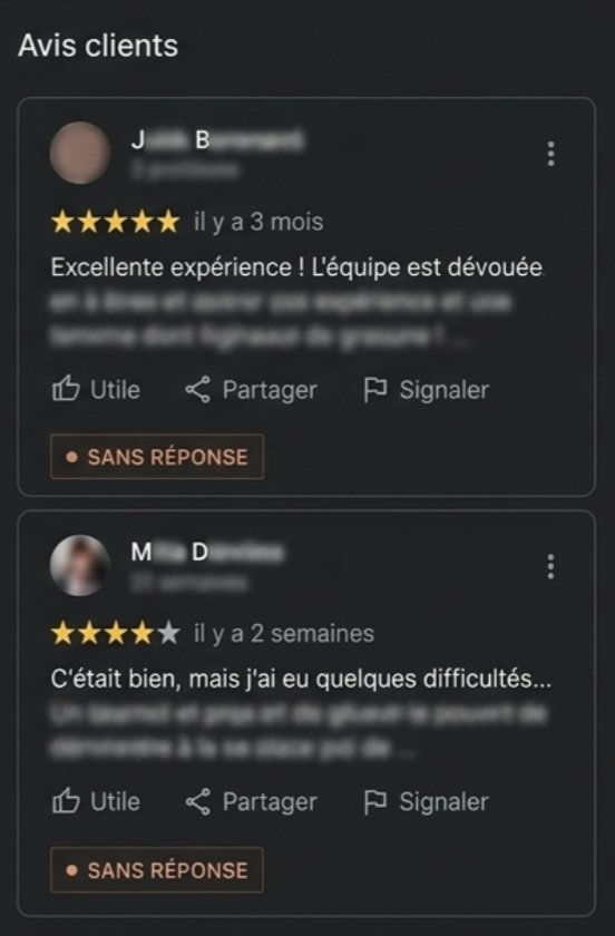Réponses aux avis dans les 48h. Premiers rendez-vous de la relance dans les 2 premières semaines.Review responses within 48h. First reactivation appointments within 2 weeks.